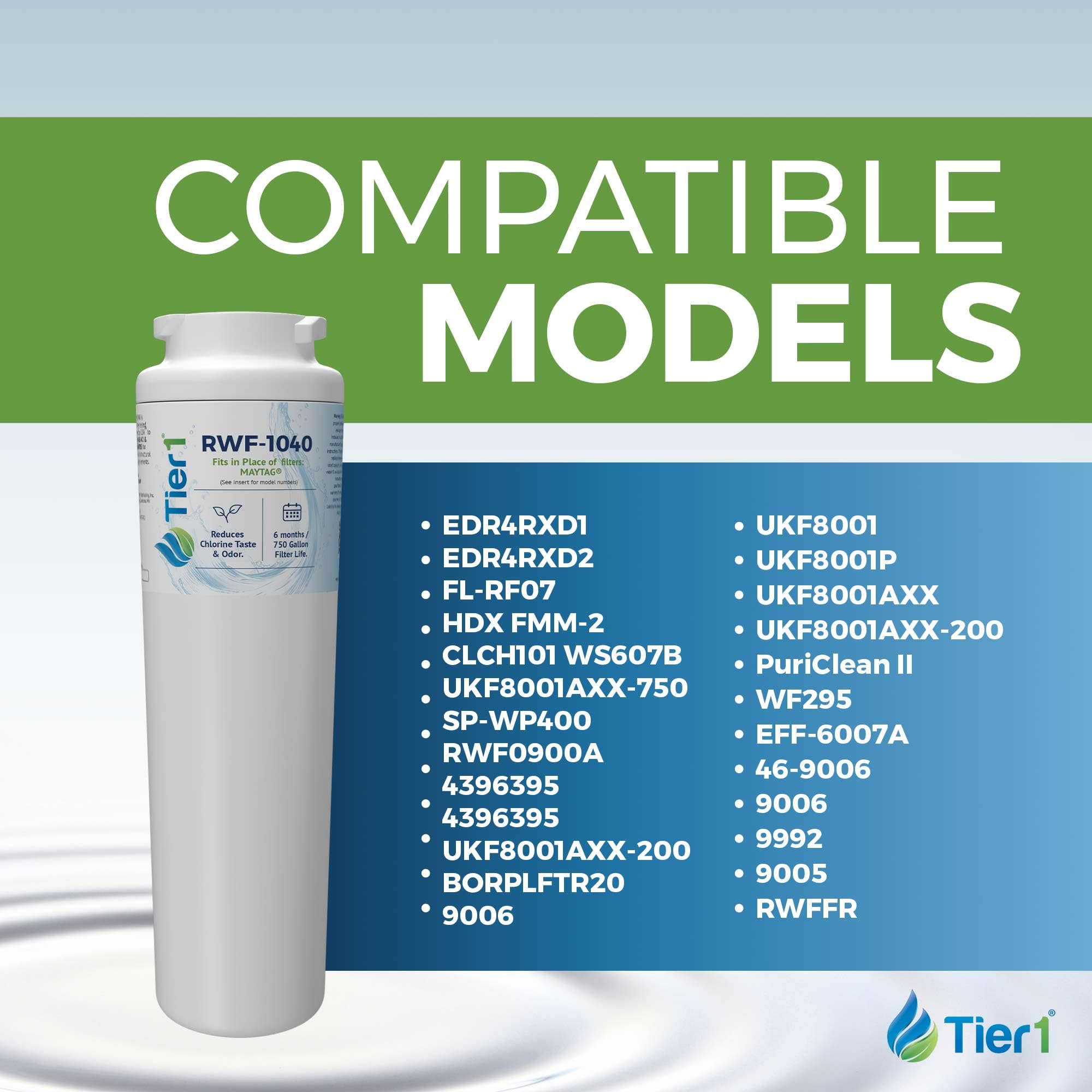 - COMPATIBLE REPLACEMENT MODELS – This water filter is a replacement for EDR4RXD1, EDR4RXD2, FL-RF07, HDX FMM-2, CLCH101, WS607B, UKF8001AXX-750, SP-WP400, RWF0900A, 4396395, 4396395, UKF8001AXX-200, BORPLFTR20, 9006, UKF8001, UKF8001P, UKF8001AXX, UKF8001AXX-200, PuriClean II, WF295, EFF-6007A, 46-9006, 9006, 9992, 9005, 9084, RWFFR, 67006475, CF5, EBL7770, CWMF004, MPF15090, RFC0900A, PL-400, PG-8001, SGF-M9, AQF-FF07, WD-F07, R-9006, GF-8001, DWF-9, UKF8001P, UKF9001, RWFFR, 67003523-750.